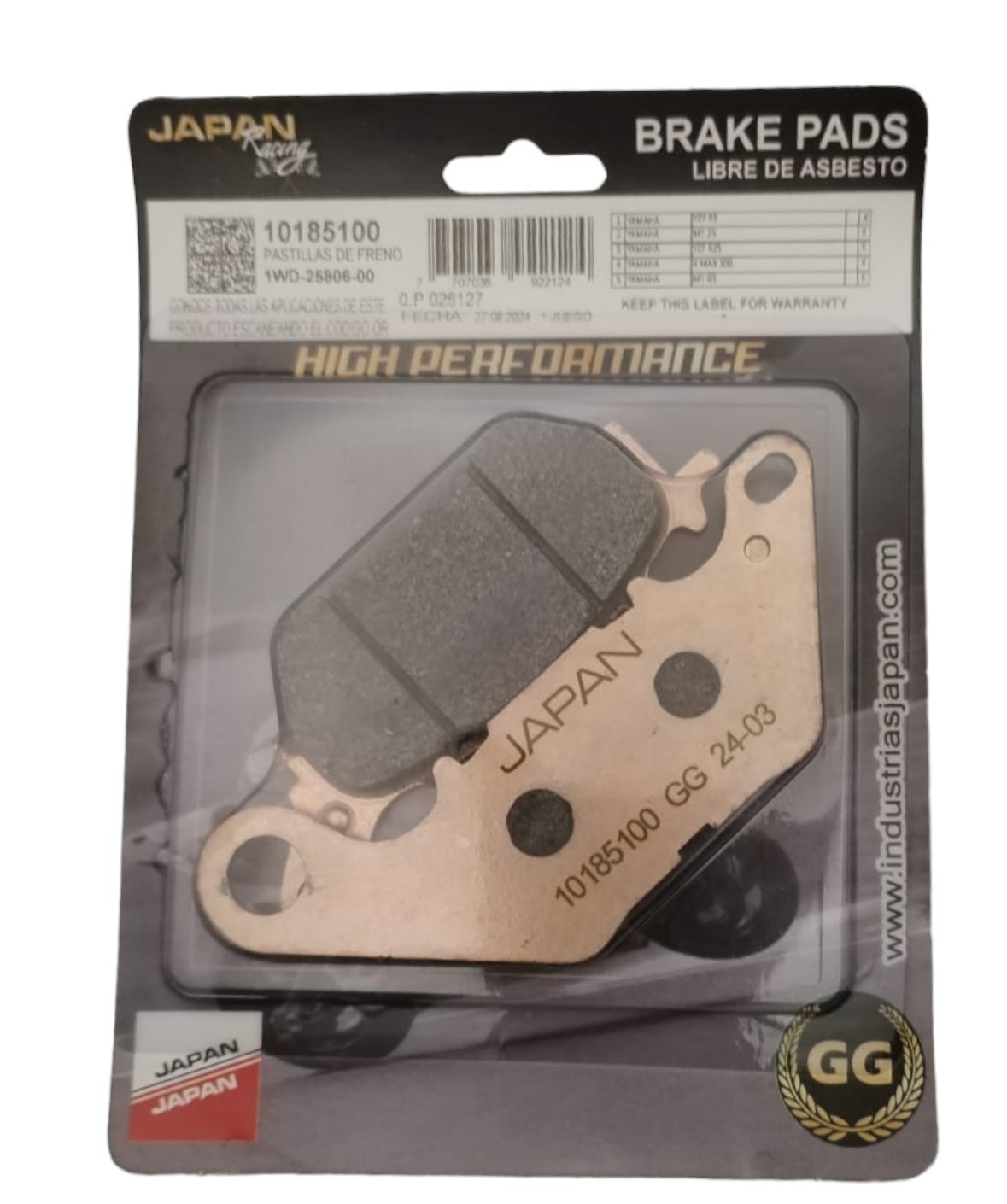 PASTILLA FRENO TRASERA R3 / MT03 MARCA: JAPAN RACING REF: 0185100